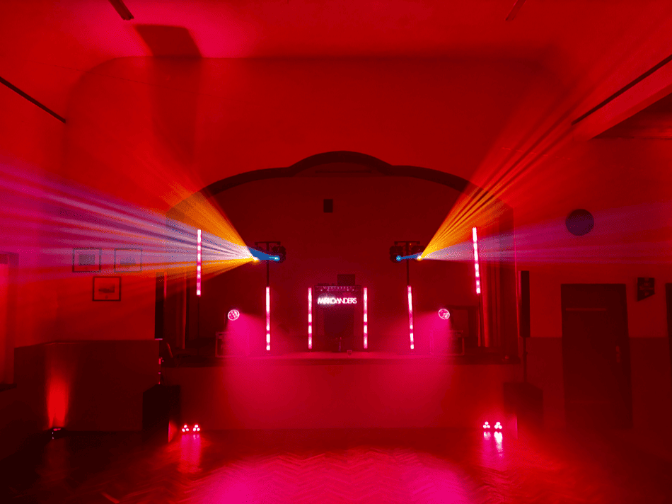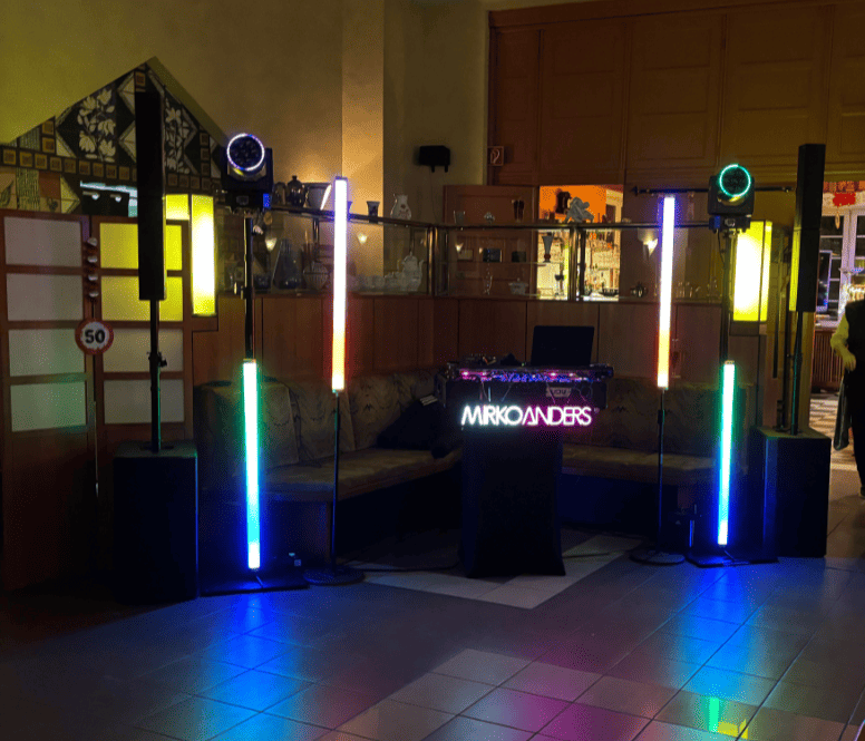 Für diesen Zweck setze ich Akku-Floor-Spots der Marke BeamZ ein. Diese ermöglichen eine kabellose Beleuchtung sämtlicher Bereiche des Raumes und lassen sich zudem bequem per Funk steuern, wodurch Anpassungen jederzeit realisierbar sind. Die Farbgestaltung können Sie entweder frei nach Ihren Wünschen festlegen oder mir die Entscheidung überlassen, wobei Sie auf meine Expertise vertrauen. Die eingesetzte Technik wird selbstverständlich an die räumlichen Gegebenheiten angepasst, die mir zur Verfügung stehen. Bitte berücksichtigen Sie dies bei der Auswahl Ihrer Location. Was nützt eine ansprechende Räumlichkeit, wenn der DJ und die Tanzfläche lediglich in einer kleinen Ecke untergebracht sind? Zudem eigenen sich Räume mit hellen Wänden deutlich besser als dunkle Gartenlokale, um mit Licht eine ansprechende Atmosphäre zu schaffen .